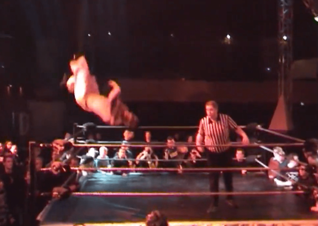 Geordie legend PAC is here now to defend against X-Dream, a fairly decent high flier from the German scene. X-Dream (like, extreme – get it?) was considered one of the better light heavyweights in Germany in the 2000s but he retired in 2011. Watching this match, it’s certainly the most ‘contemporary’ of the show so far at least in terms of style. There’s a segment when PAC can’t manage to fully hit anything on Dream – getting to the point where he attempts a frontal atomic drop but Dream counters it by landing in the splits. This infuriates PAC and makes him try a standing moonsault which he overcooks and completely crashes and burns.